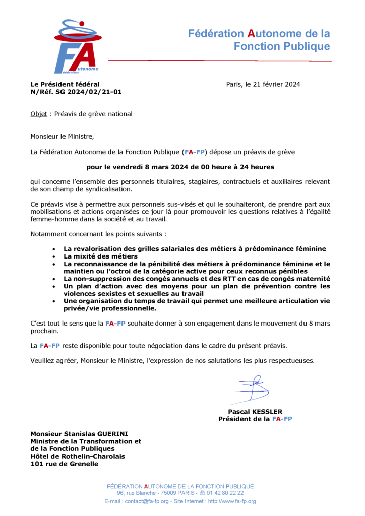 La Fédération Autonome de la Fonction Publique (FA-FP) dépose un préavis de grève